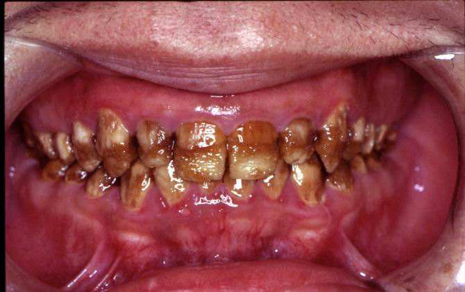 3.重度氟斑牙/缺损型:牙面出现很深的黄色、黄褐或棕褐色,牙面还出现浅窝或坑凹状缺损,或因磨损使牙失去正常外形。