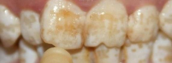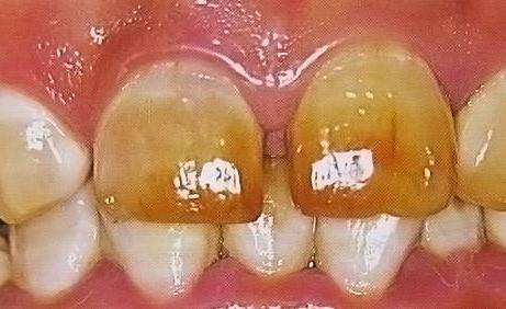 2.中度氟斑牙/变色型:牙面出现较深的黄色、黄褐或棕褐色;